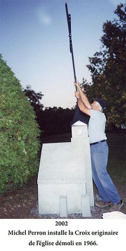 The spruce tree that grows in front of the church was planted in 1996 to commemorate the 40th anniversary of Les Filles de la Sagesse’s presence and influence in the village. The cement structure on the church grounds is a replica of the church demolished in 1966 and the cross on it is the original cross from the old building. This structure, a time capsule, was unveiled at the parish’s 100th anniversary celebrated in 2002 and is to be opened in 2102.